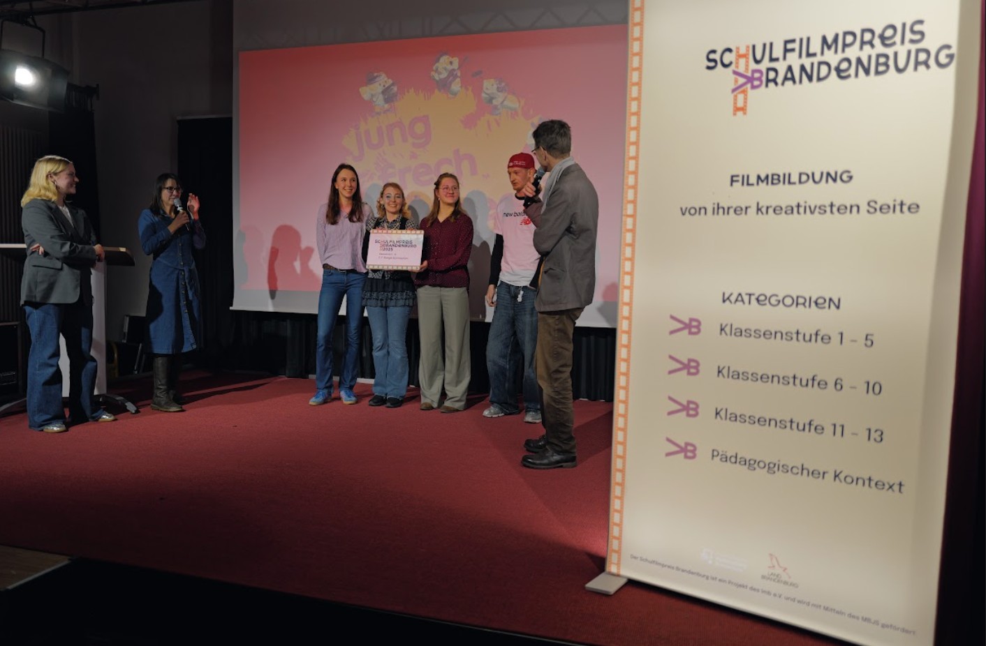 In der Kategorie „Klassenstufen 11-13“ gewann unsere Film-AG den 1. Platz und wurde mit dem Schulfilmpreis Brandenburg 2025 ausgezeichnet. Bei der Preisverleihung waren anwesend: Juliane O., Charlett K., Hannah S. und Collin W. aus den Jahrgangsstufen 11 – 12. Wir wünschen unserer Film-AG weiterhin viel Erfolg und frohes kreatives Schaffen.