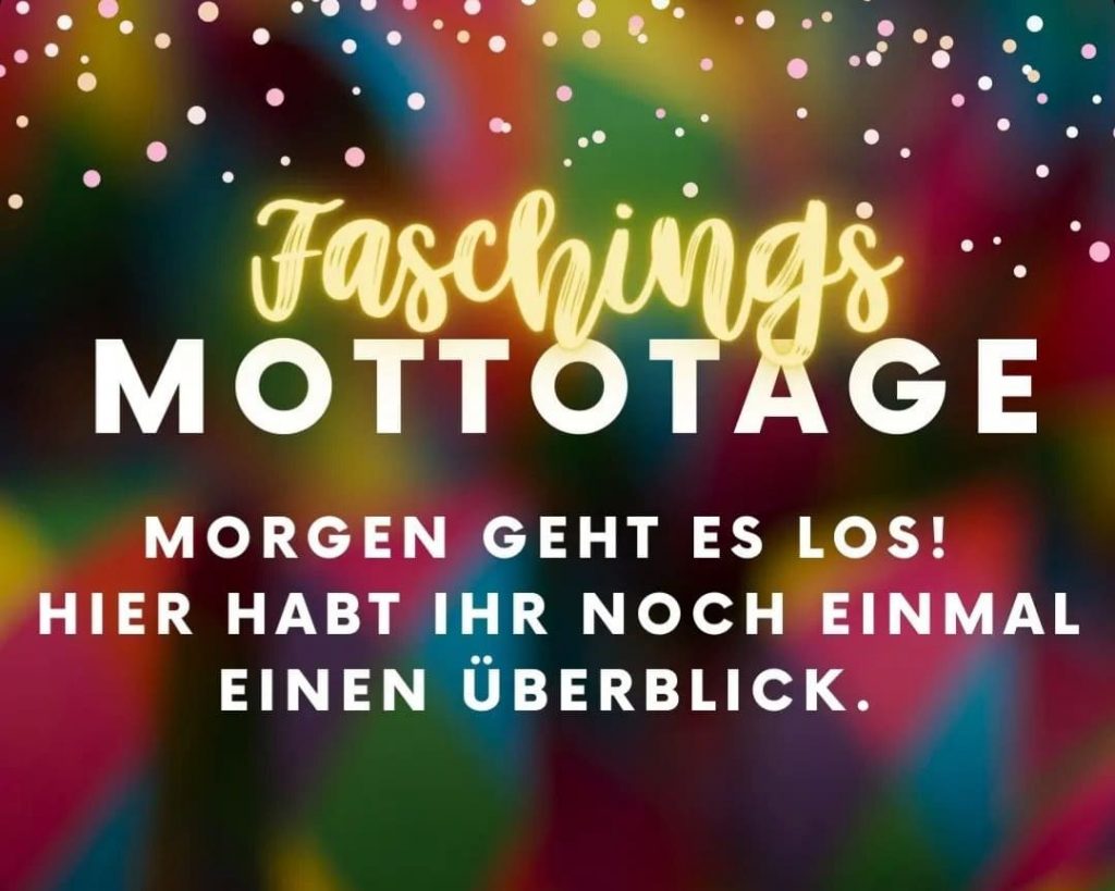 Wir freuen uns auf eure Verkleidungen in den kommenden Faschingstagen. Hier sind die Mottos, die auf unserem Instagram-Kanal gewählt wurden: Montag, 20.02.: Overdressed Dienstag, 21.02.: Underdressed/Schlafanzug Mittwoch, 22.02.: Hobby