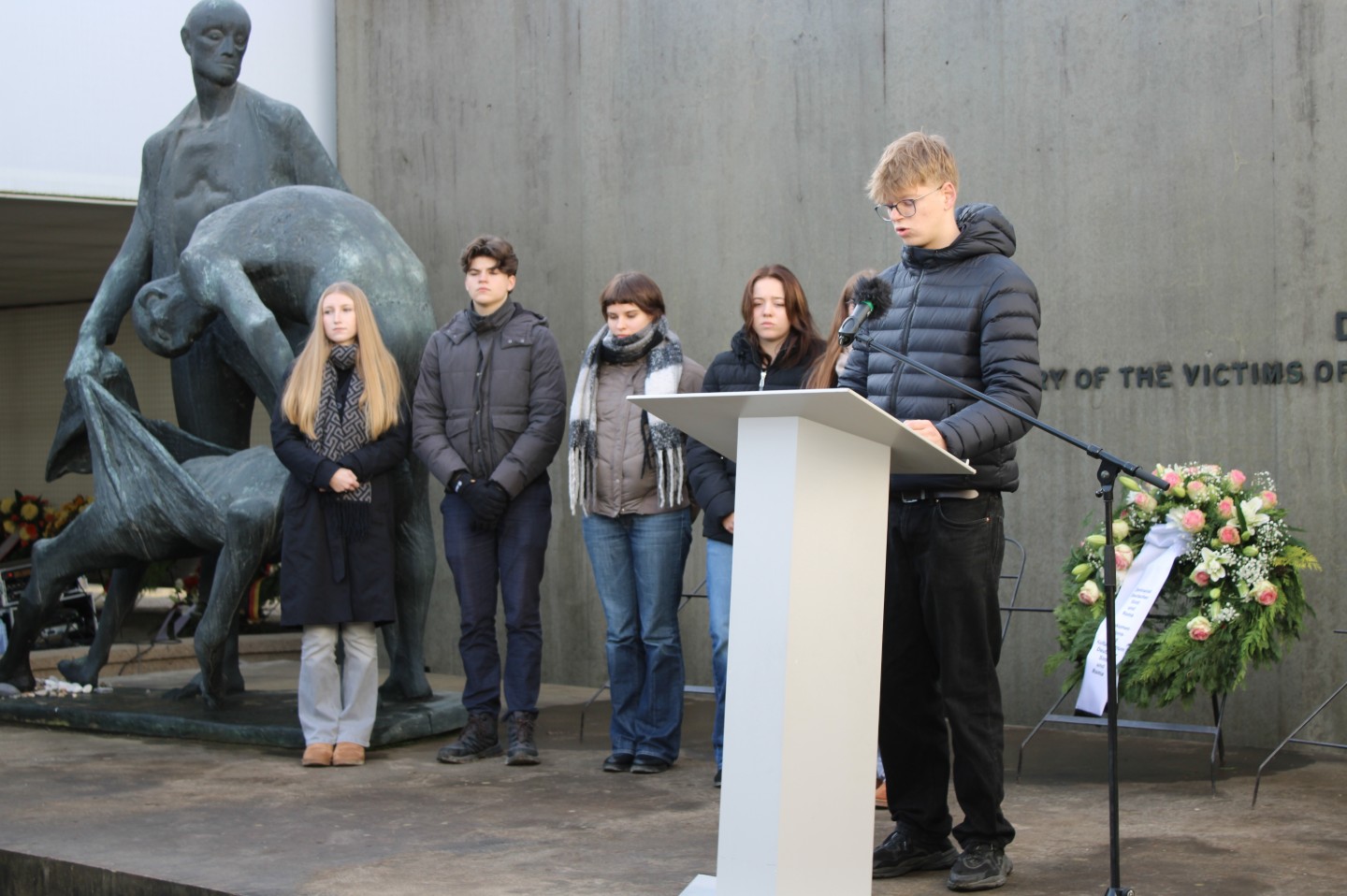 Im Rahmen der Kranzniederlegung wurde still an die hunderttausenden ermordeten Sinti und Roma erinnert. Besonders bewegend war, dass Romani Rose sich im Anschluss persönlich bei allen beteiligten Schülerinnen und Schülern für ihr Engagement, ihr Interesse und ihren respektvollen Beitrag zum Gedenken bedankte. Dieses Zeichen der Anerkennung unterstrich die Bedeutung der aktiven Auseinandersetzung junger Menschen mit der Geschichte.